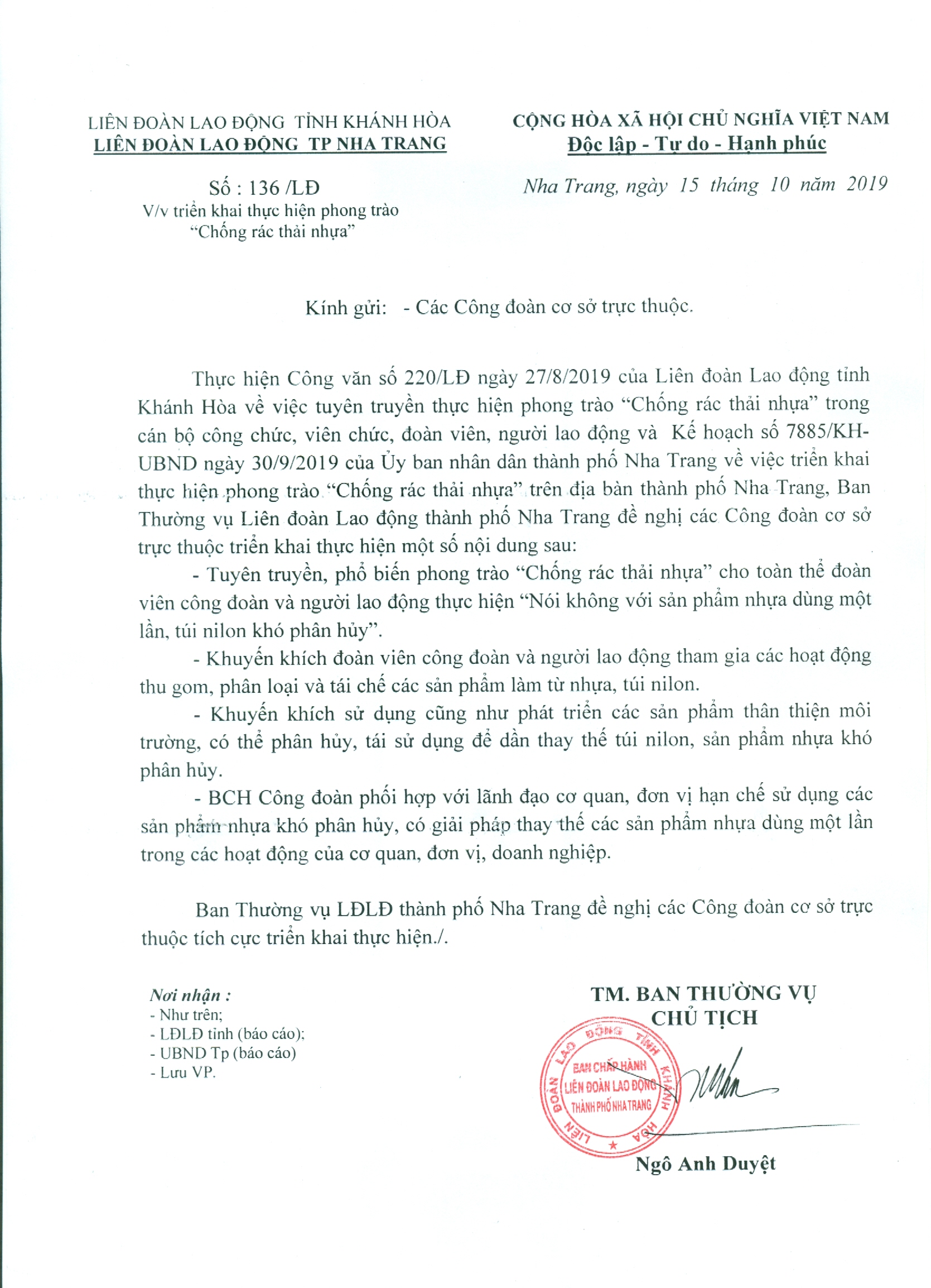 V/v triển khai thực hiện phong trào "Chống rác thải nhựa"