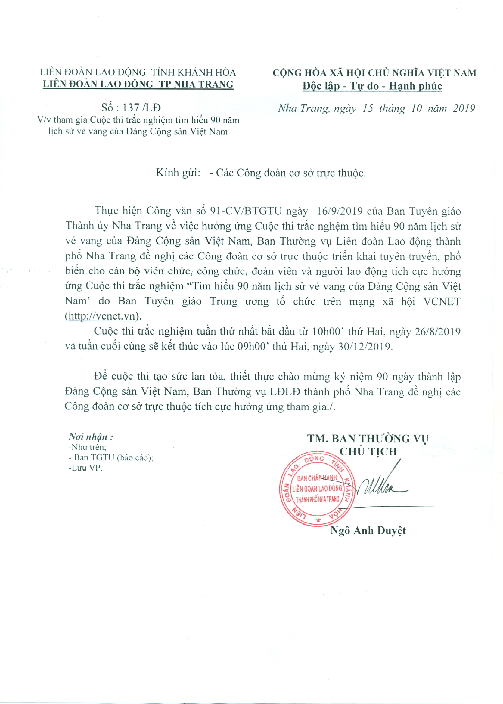V/v tham gia Cuộc thi trắc nghiệm tìm hiểu 90 năm lịch sử vẻ vang của Đảng Cộng sản Việt Nam
